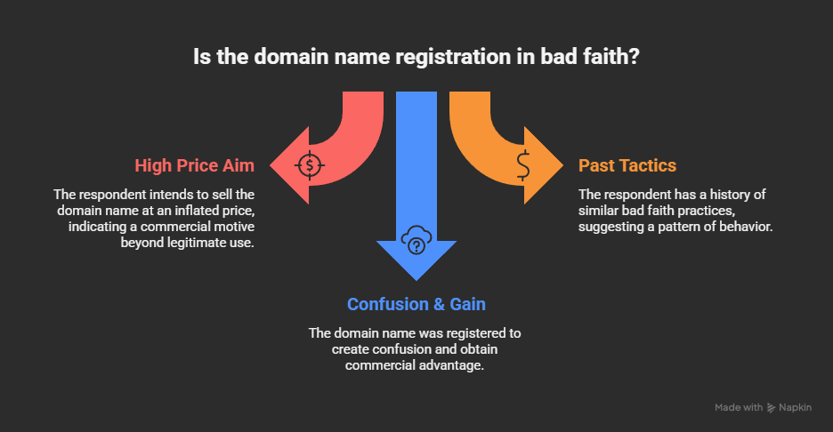 Panels generally find bad faith in cases where the domain name is offered for sale for an amount exceeding the regular registration costs. However, given that domain name selling might be a legitimate business (e.g. dictionary terms are considered valuable assets for domain name investors), the respondent’s offer to sell alone would not suffice to prove the respondent’s bad faith.